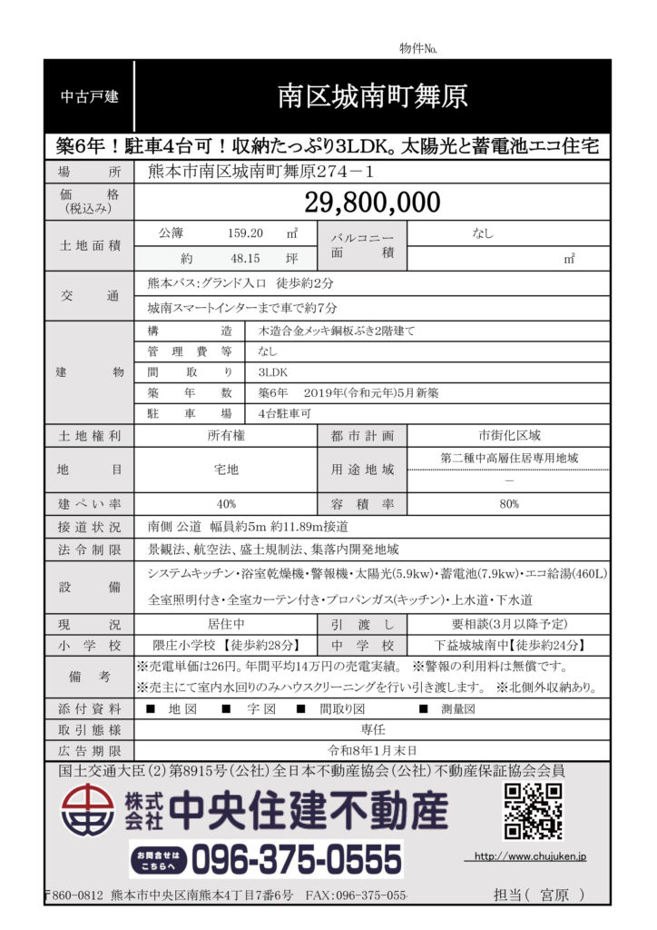 築6年!駐車4台可!収納たっぷり3LDK。太陽光と蓄電池エコ住宅