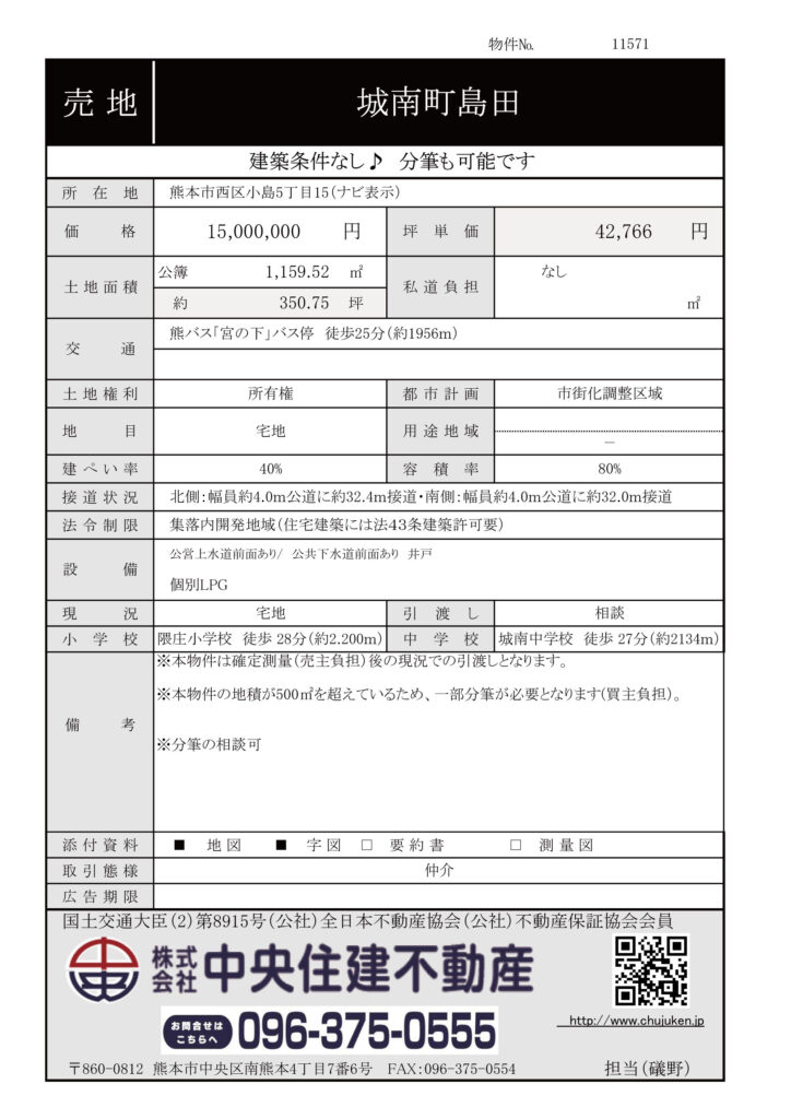 ※本物件の地積が500㎡を超えているため、一部分筆が必要となります(買主負担)。
